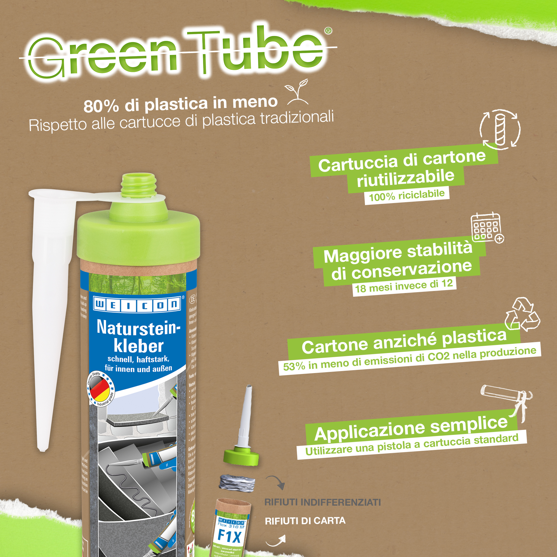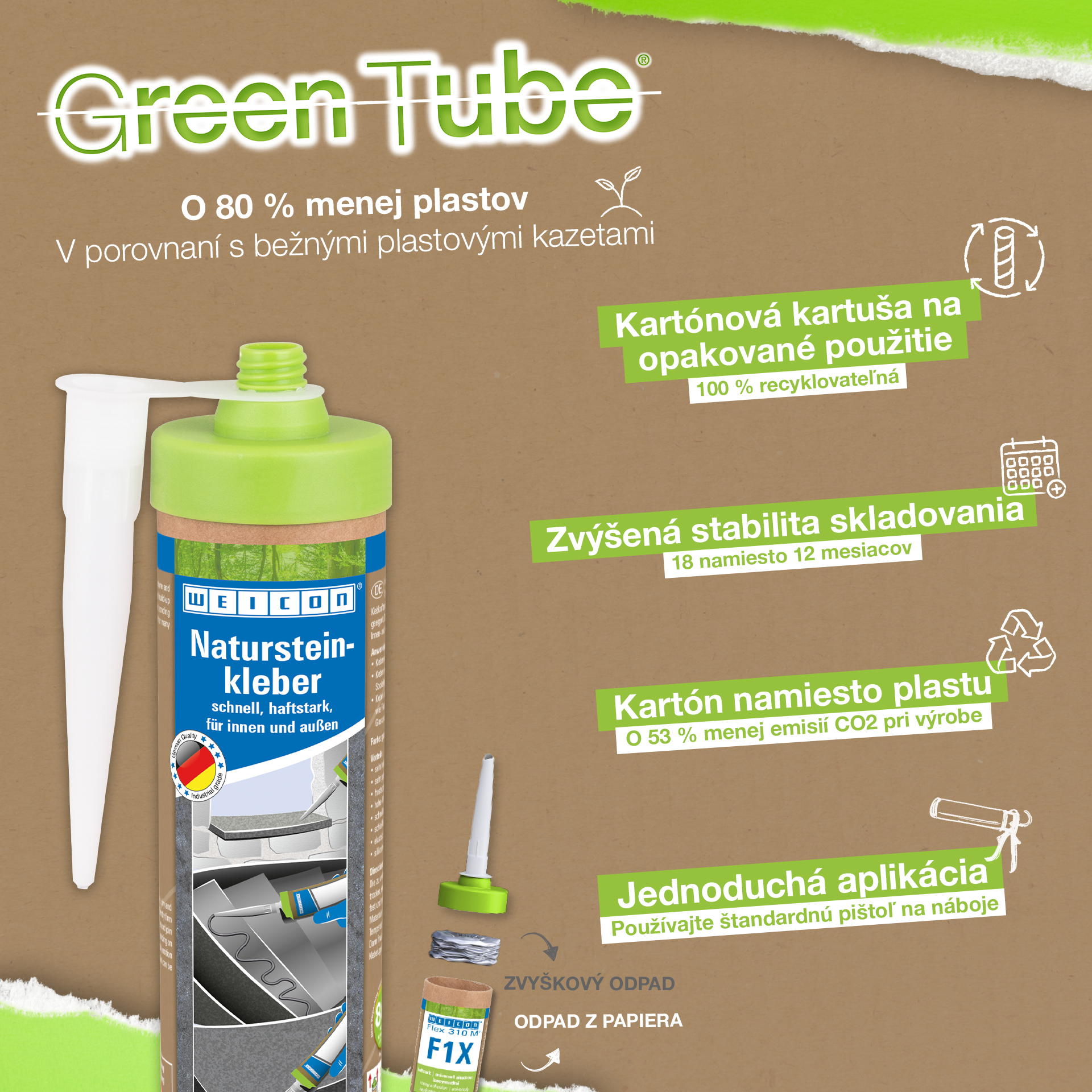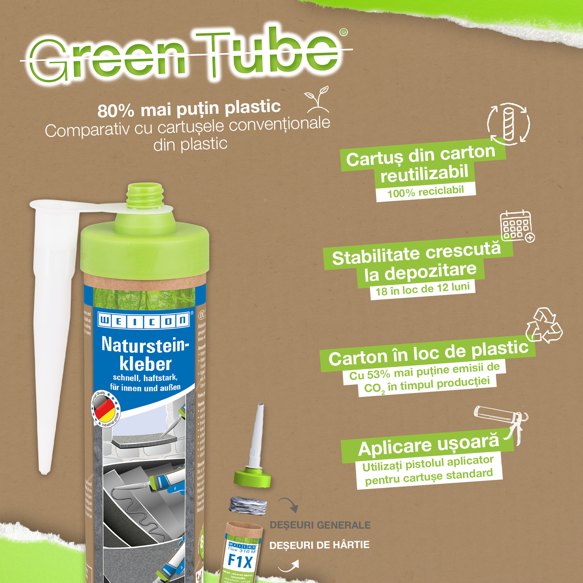 Adezivul WEICON pentru piatră naturală este un adeziv puternic pentru fixarea pietrei naturale, pietrei decorative și a ceramicii Datorită aderenței sale inițiale foarte ridicate și a creșterii rapide a puterii adezive, lipirea este posibilă chiar și pe suprafețe verticale, cum ar fi pereții. Adezivul pentru piatră este potrivit pentru multe aplicații de interior și exterior. Este rezistent la îngheț, are o rezistență la temperaturi ridicate de la -40°C la +90°C, precum și rezistență ridicată la intemperii și UV. Adezivul pentru piatră naturală se întărește rapid și are o rezistență finală foarte mare. După întărire, adezivul poate fi șlefuit și rămâne elastic pentru a compensa mișcările. Adezivul pentru piatră nu conține silicon, izocianați, halogeni și solvenți. Poate fi utilizat într-o mare varietate de aplicații, de exemplu, pentru lipirea pervazurilor de ferestre, a plăcilor, a plintei, a mulurilor decorative sau a treptelor de scări. Adezivul pentru piatră naturală WEICON aderă foarte bine la o mare varietate de materiale, cum ar fi lemnul, materialele pe bază de lemn, materialele plastice, metalele, sticla și substraturile minerale. Este disponibil în culorile gri și alb.