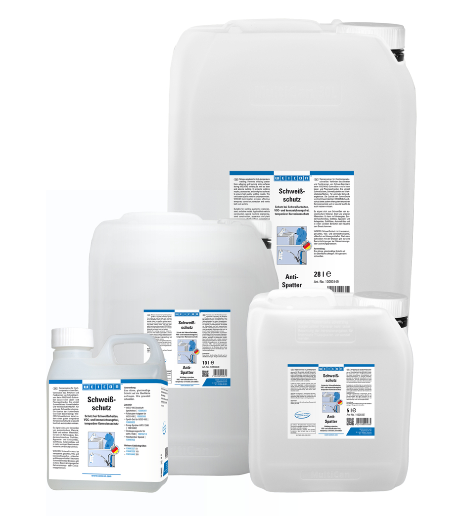 WEICON Anti-Stropi este o emulsie de separare pentru aplicații de sudură la temperaturi ridicate. Previne aderența și arderea stropilor de sudură pe suprafețe în timpul sudării MIG/MAG, precum și al tăierii cu laser și plasmă. Protejează duzele de sudură, accesoriile de sudură și suprafețele pieselor de lucru, asigurând rezultate excelente la sudare. Calitatea cordonului de sudură rămâne neafectată. WEICON Anti-Stropi oferă, de asemenea, protecție temporară eficientă împotriva coroziunii și este eficient atât umed cât și uscat. Este potrivit pentru sudarea materialelor de tip austenită, oțel și a multor alte metale. Produsul poate fi utilizat în construcția de vehicule, construcția de mașini speciale, construcția de oțel, construcția de aparate și instalații, construcția de nave, construcția de automobile și multe alte sectoare industriale. WEICON Anti-Stropi este transparent, inodor, fără COV, nepericulos, fără silicon și fără conținut de solvent. După sudare, emulsia nu interferează cu procesele de galvanizare sau vopsire.