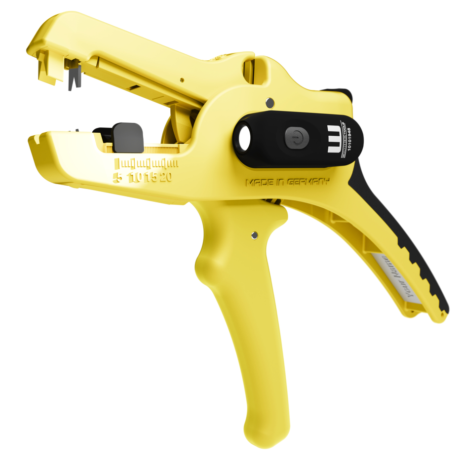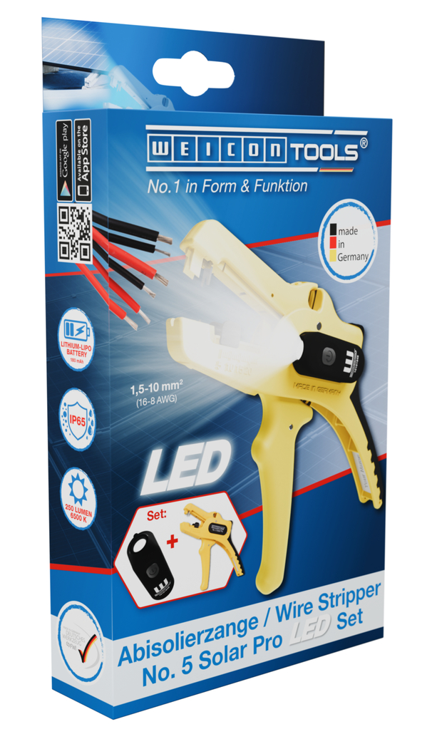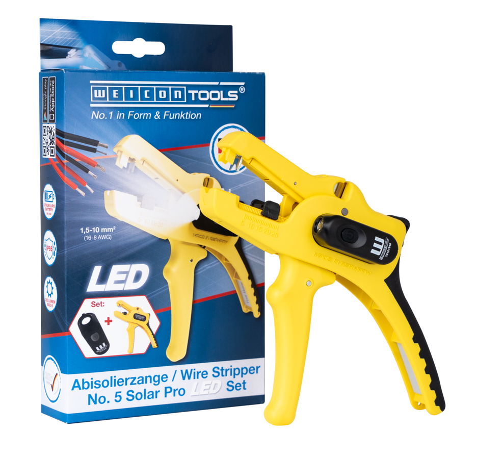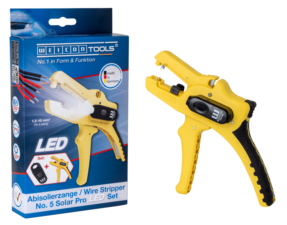 Wire Stripper No. 5 Solar Pro: special tool for the stripping and skinning of all common cables in the solar sector I large, powerful stripping range from 1.5 mm²–10 mm² I precise working thanks to adjustable length stop (5–25 mm) I integrated, easily accessible side cutter up to 3 mm Ø Cu/Al I ergonomically designed, non-slip multi-component handle I LED Work Light: the integrated LED light ensures a well-illuminated working area that allows you to work safely with both hands I powerful and rechargeable lithium battery with 180 mAh I 2 hours of bright light (at level 2) after a charging time of 40 minutes I three brightness settings with up to 250 lumens, light colour: 6500K I dustproof, splash-resistant and impact-resistant housing made of polycarbonate, tested acc. to IP65 protection code I can be used with many WEICON TOOLS wire strippers