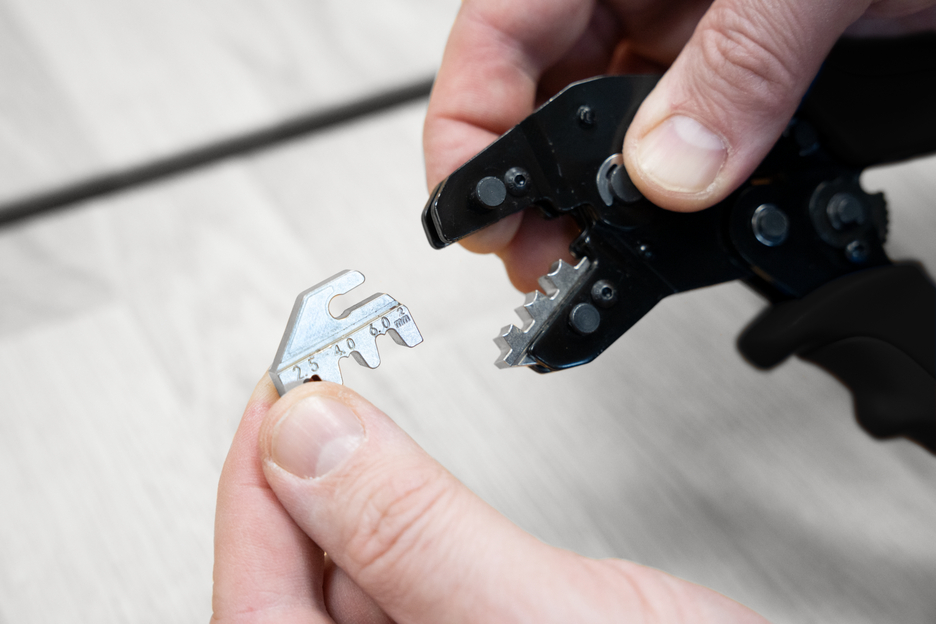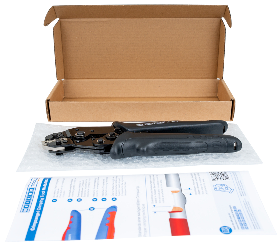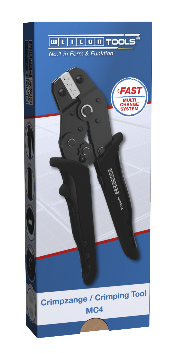 MC4-Crimp has been specially developed for the process-safe crimping of MC4 connectors on PV systems. The crimping tool has a ratchet mechanism with a blocking device to ensure a consistently high crimping quality and results that can be precisely repeated. The mechanism only opens the tool when the crimping process is complete. An emergency release has also been integrated into the handle, which opens the crimping tool in the event of misuse. Thanks to the accurate eccentric setting of the tool, the crimping force can be precisely adjusted. This feature ensures a consistently high crimping quality. With the Multi Change System, the crimping modules of the tool can be exchanged quickly, as needed. The simple change system, which requires no additional tools, ensures that the modules can be installed and removed fast. The standard version of the MC4 crimping tool is supplied with a high-quality steel module for MC4 connectors with cable cross-sections of 2.5 mm², 4 mm² and 6 mm² (14-10 AWG). The 2-component handles of the crimping tool ensure non-slip and ergonomically friendly handling with maximum force transmission. The tried and tested “ice-crack design” was used, which ensures a comfortable feel. The integrated eyelets on the handles offer the option of attaching a safety catch.