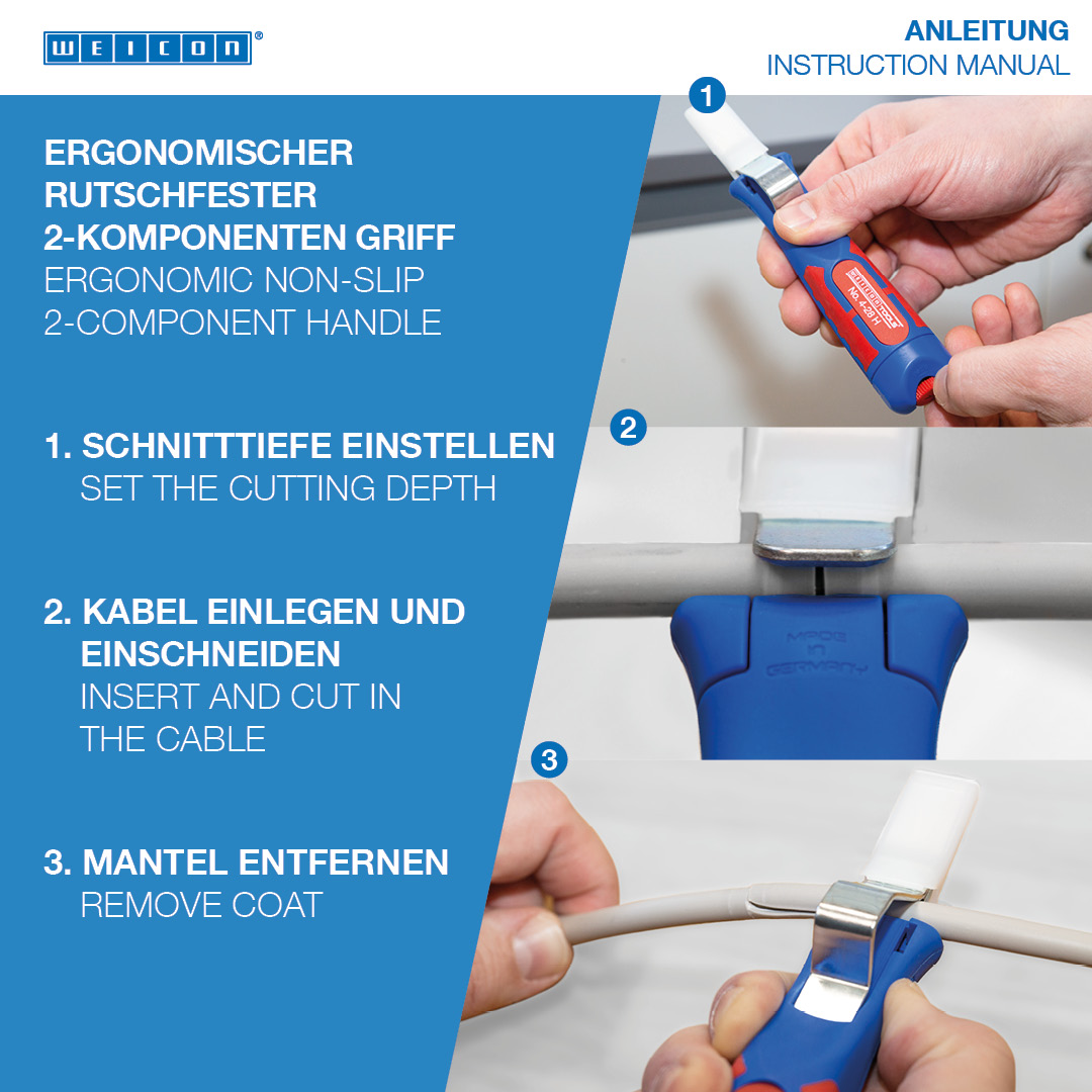 mâner cu diametru mare și zone de prindere optime pentru lucrări precise fără alunecare; rotiță de ajustare ușor de manevrat cu reglaje foarte fine; dezizolare precisă, rapidă și sigură; înlocuire rapidă a lamelor grație montajului tip baionetă