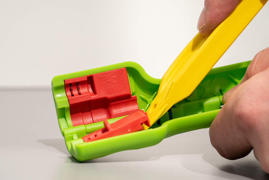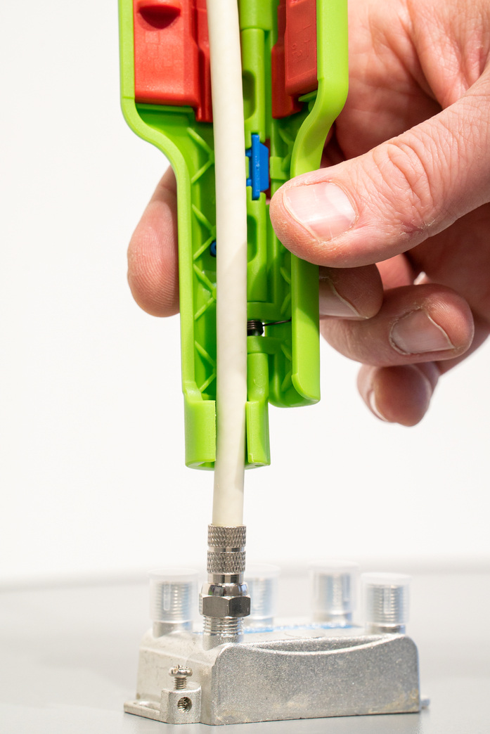 Falci de prindere pentru montarea mufelor de tip F pe cablu; economie de spațiu la montarea și demontarea mufelor de tip F grație cheii hexagonale integrate de 11 mm (SW 11); dezizolare fara necesitatea de ajustarea a lamelor datorita opritorului de lungime setat pentru mufele de tip F uzuale (6/4 mm); Optional: Sunt disponibile inserții modulare cu cuțite pentru dezizolarea altor dimensiuni (de ex. pentru mufe F de compresie 6,5 x 6,5 mm)
