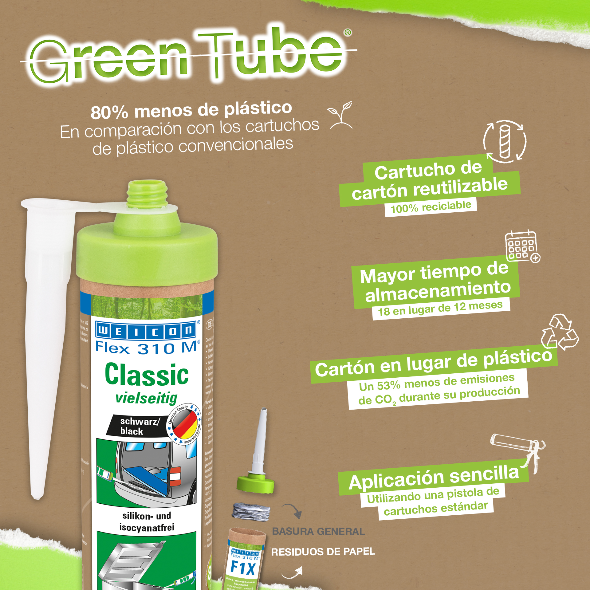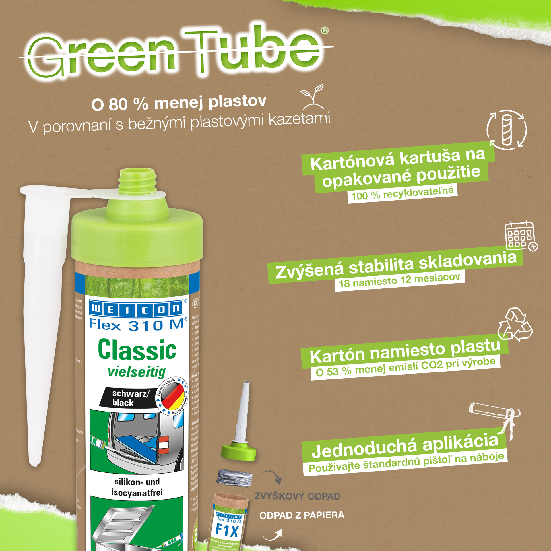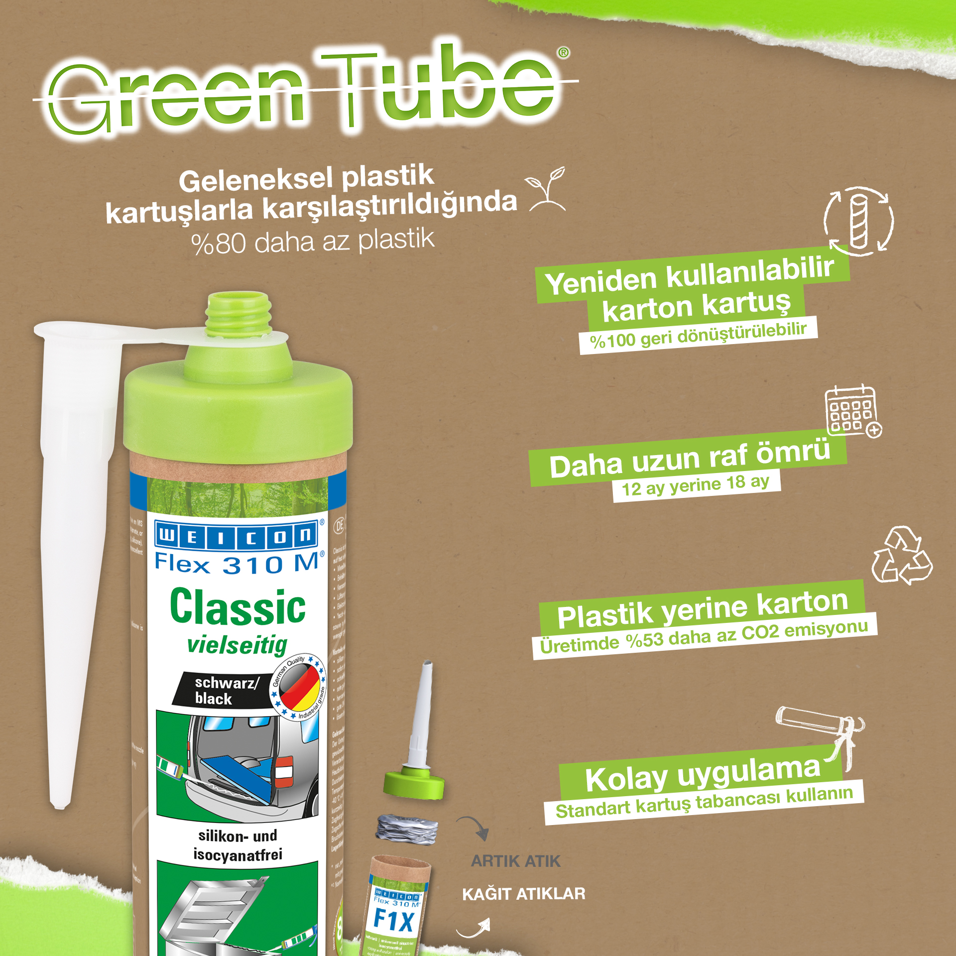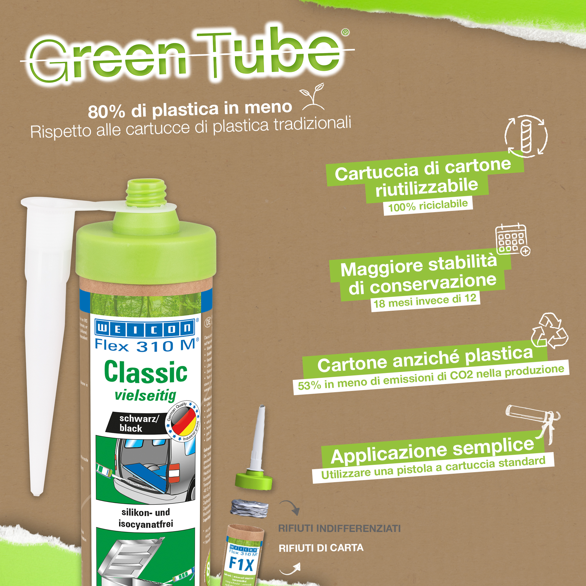 Adezivul si etansantul WEICON Flex 310 M Clasic are o putere mare de lipire, poate fi vopsit (umed-pe-umed), slefuit, are o stabilitate la imbatranire remarcabila si o buna rezistenta la raze UV. Este rezistent si la apa dulce si apa sarata, nu contine silicon, izocianati, halogeni sau solventi. Produsul detine certificat ISEGA prin urmare poate fi utilizat ca si adeziv in industria alimentara. Flex 310 M Clasic este un adeziv pe baza de MS polimer si se preteaza la lipirea metalelor, a multor materiale plastice, a ceramicii, lemnului, sticlei si pietrei. WEICON Flex 310 M Clasic poate fi utilizat in industria metalurgica, la fabricarea de dispozitive si rezervoare, la constructia de sasiuri, vehicule si containere, la sistemele de ventilatie si aer conditionat, in industria electrica, la constructia de yahturi si ambarcatiuni si in toate aplicatiile la care nu este posibila utilizarea de silicon sau de produse cu continut de silicon.