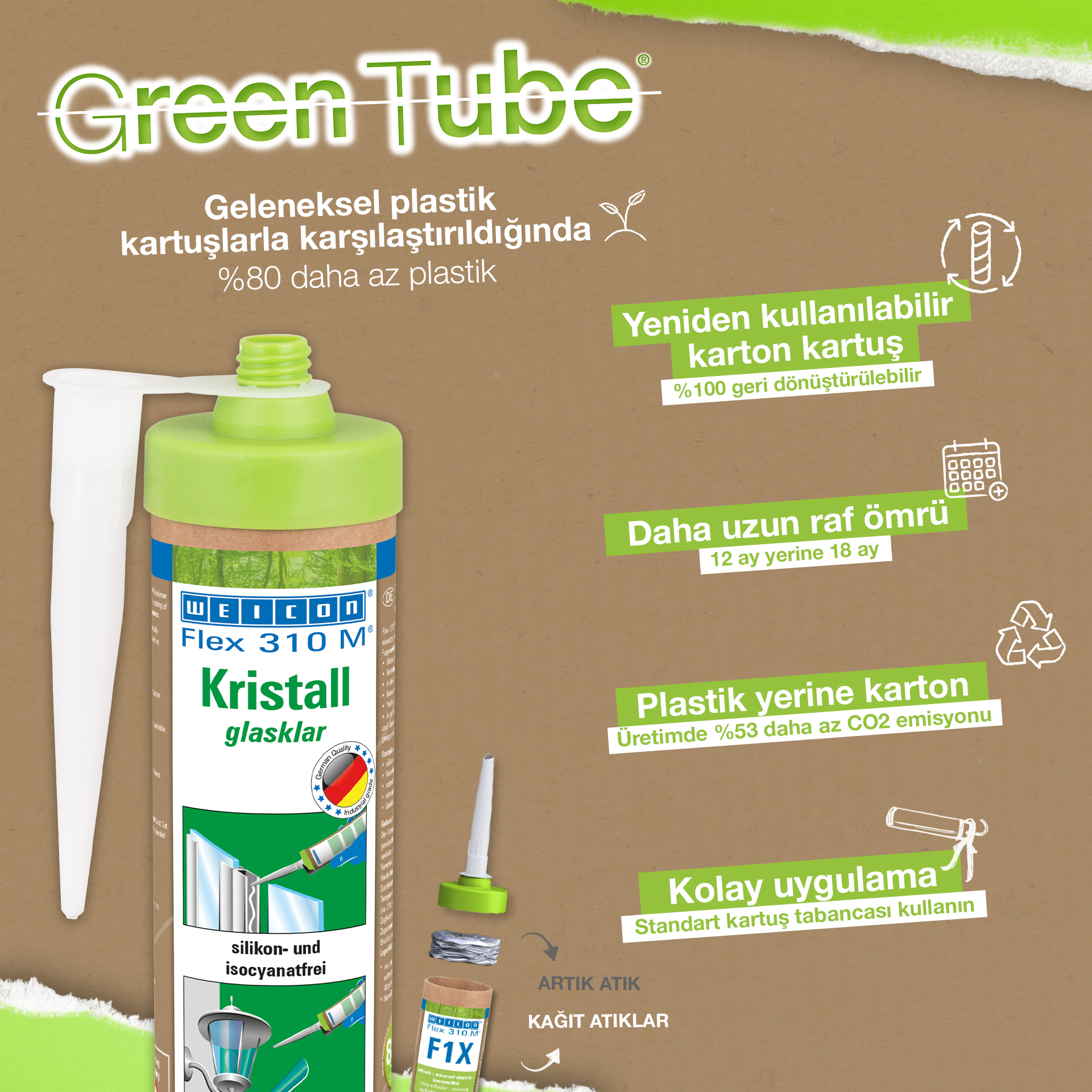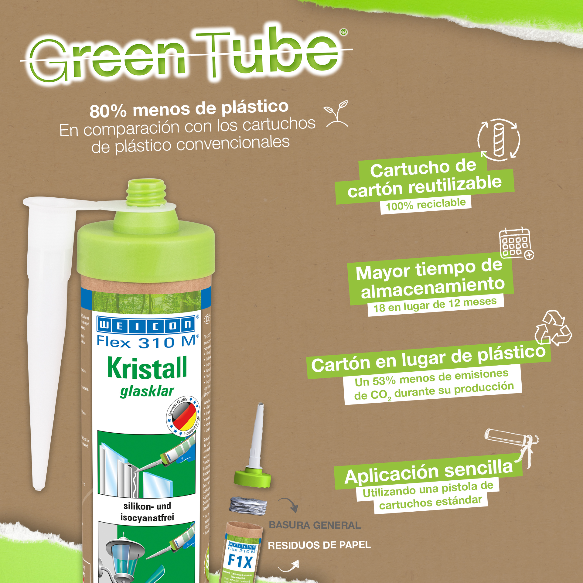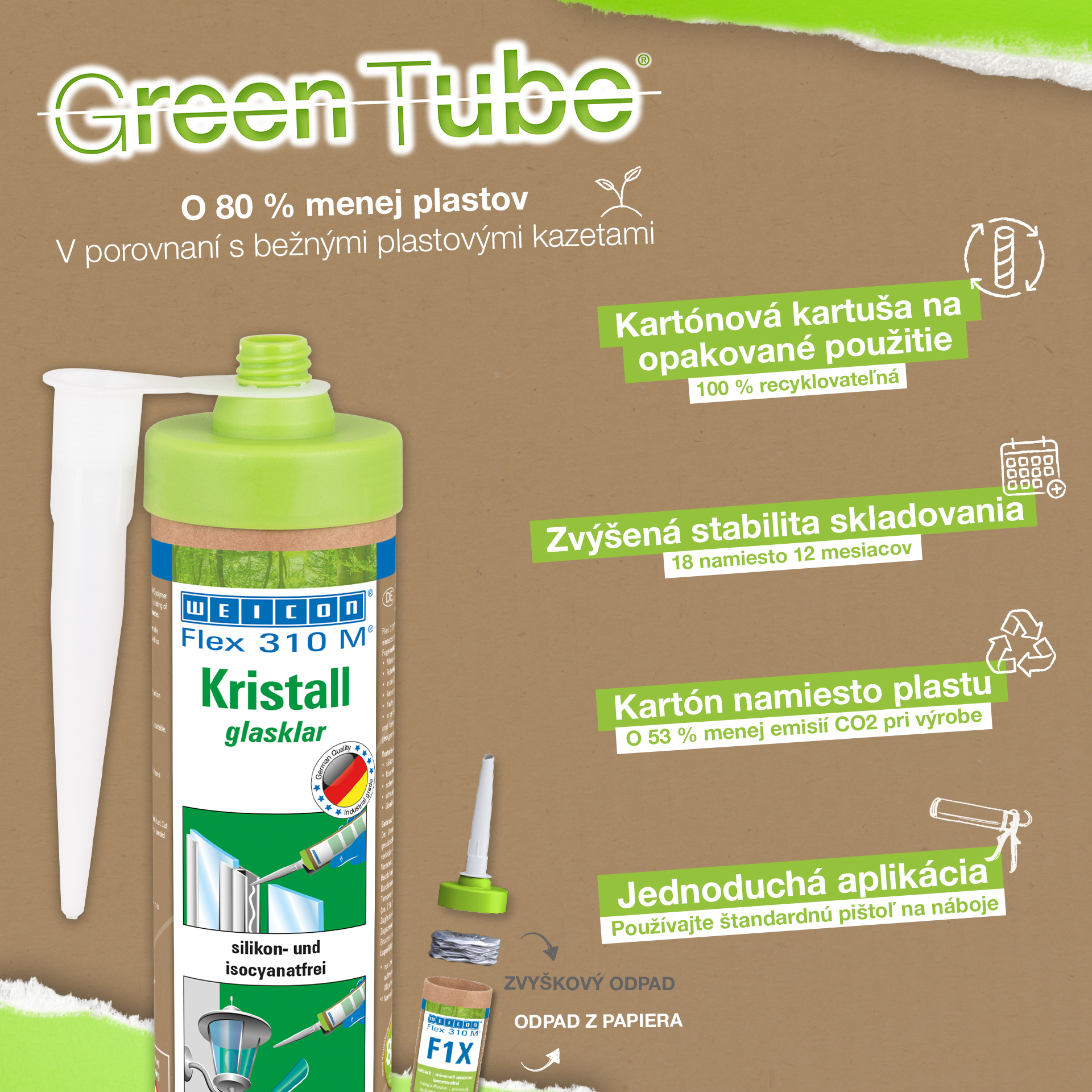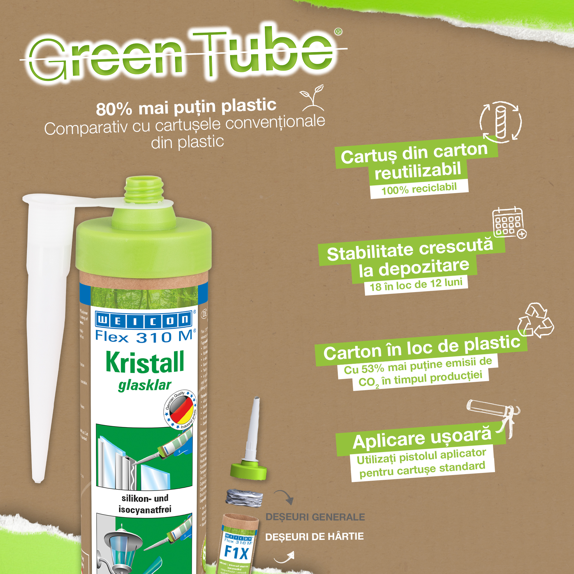Adezivul si etansantul WEICON Flex 310 M Cristal este transparent, puternic, poate fi vopsit (umed pe umed), slefuit, are o buna rezistenta la imbatranire si la actiunea razelor UV. Este rezistent si la apa dulce si apa sarata, nu contine silicon, izocianati, halogeni sau solventi. WEICON Flex 310 M Cristal detine certificat ISEGA si poate fi utilizat ca si adeziv in industria alimentara. Produsul este transparent cristal dupa intarire si este in mod special potrivit pentru imbinari elastice la care adezivul nu trebuie sa fie vizibil Flex 310 M Cristal poate fi utilizat in industria maselor plastice, industria metalurgica, la fabricarea de dispozitive si rezervoare, la sistemele de ventilatie si aer conditionat, in industria electrica si de sisteme de iluminat, la constructia de standuri expozitionale si de prezentare pentru magazine, precum si in toate aplicatiile la care nu este posibila utilizarea de silicon sau de produse cu continut de silicon. *=numai lipire fara tensionare