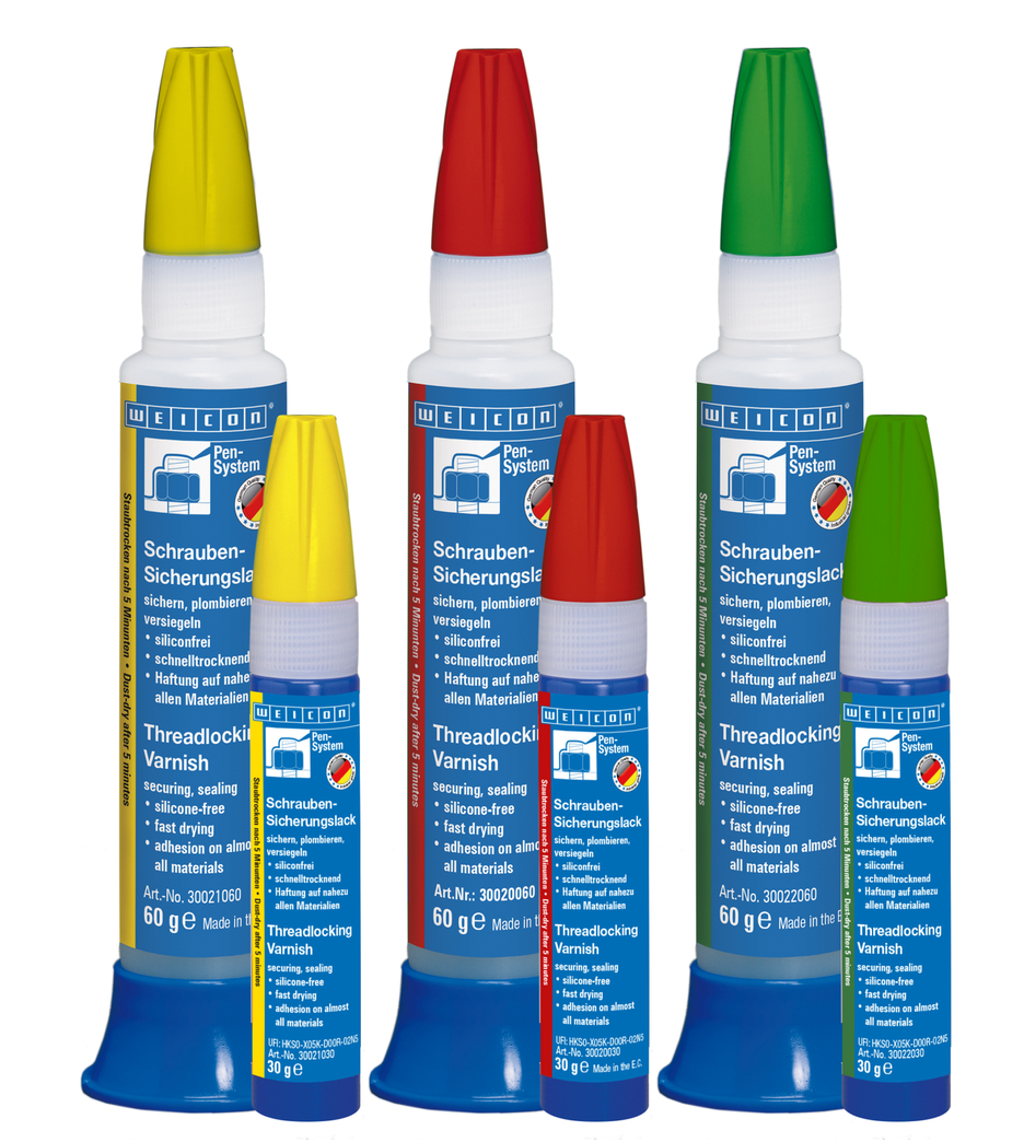 Lacul sigilant pentru suruburi este un produs de marcaj pe baza de solventi, cu uscare rapida si cu o buna aderenta la multe materiale. Lacul serveste ca sigiliu amovibil, ca protectie impotriva actiunii unor persoane neautorizate, ca invelis pentru piesele conductoare electric si ca protectie impotriva coroziunii si influentelor de contact. Lacul sigilant pentru suruburi este rezistent la apa, benzina, motorina, ulei mineral, ulei parafinic, acizi si baze diluate. Lacul sigilant este indispensabil pentru sigilarea conexiunilor insurubate de orice tip, pentru protectia impotriva manipularii si a desfacerii neautorizate a suruburilor si imbinarilor, pentru documentarea masurilor de asigurare a calitatii, pentru controlul din timpul proceselor de productie si inspectia produselor prin examinarea vizuala a pieselor insurubate. Lacul sigilant este disponibil in culorile galben, verde si rosu.