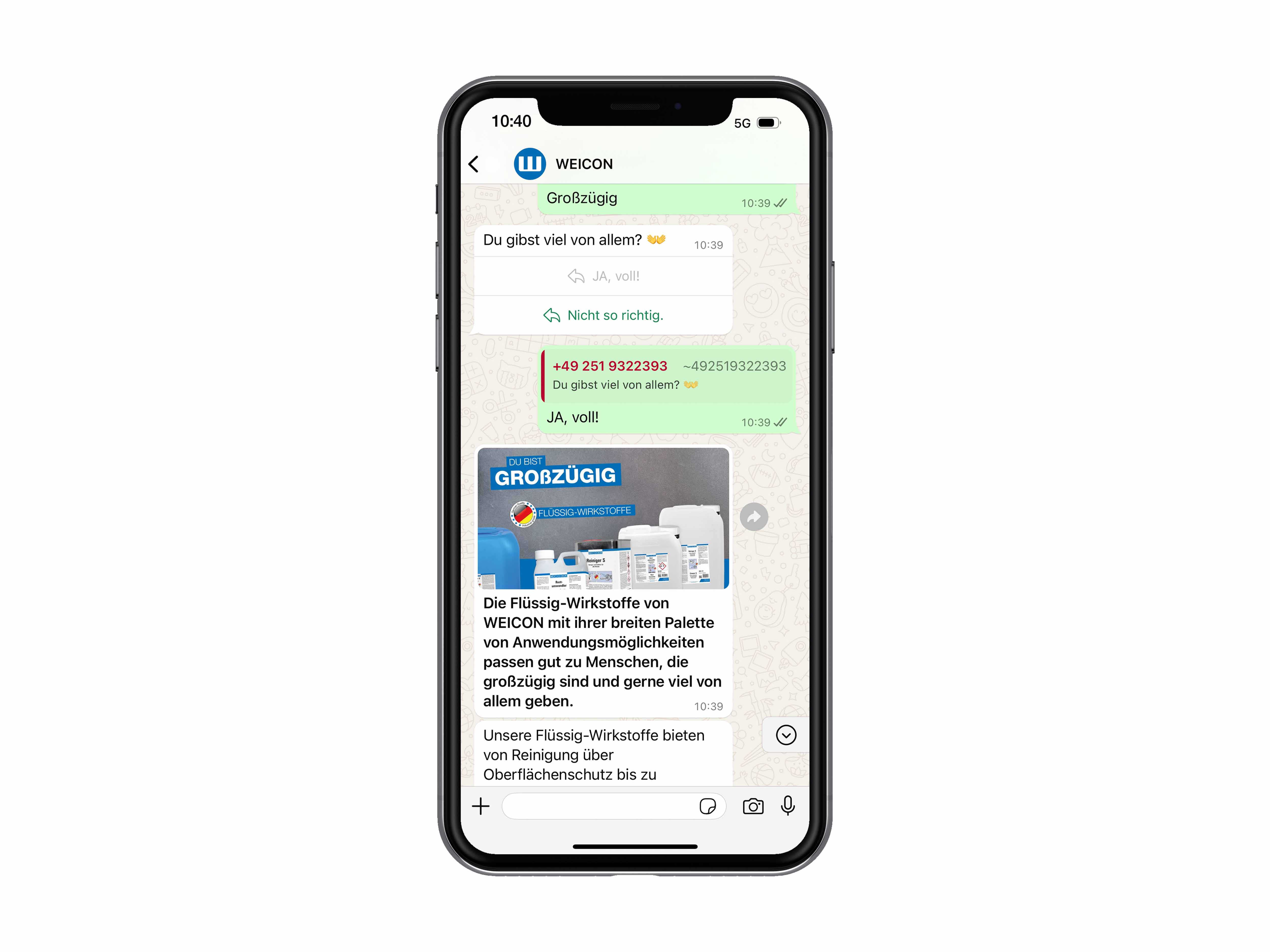 Sunteți interesat de produsele noastre dar nu știți dacă preferați să utilizați un ulei lubrifiant sau o pastă cu același rol, un adeziv monocomponent sau bicomponent sau încă vă lipsește unealta de dezizolare potrivită? Atunci utilizați serviciul nostru WhatsApp pentru a primi mai multe informații sau efectuați testul nostru „Ce tip WEICON sunt?” pe WhatsApp.