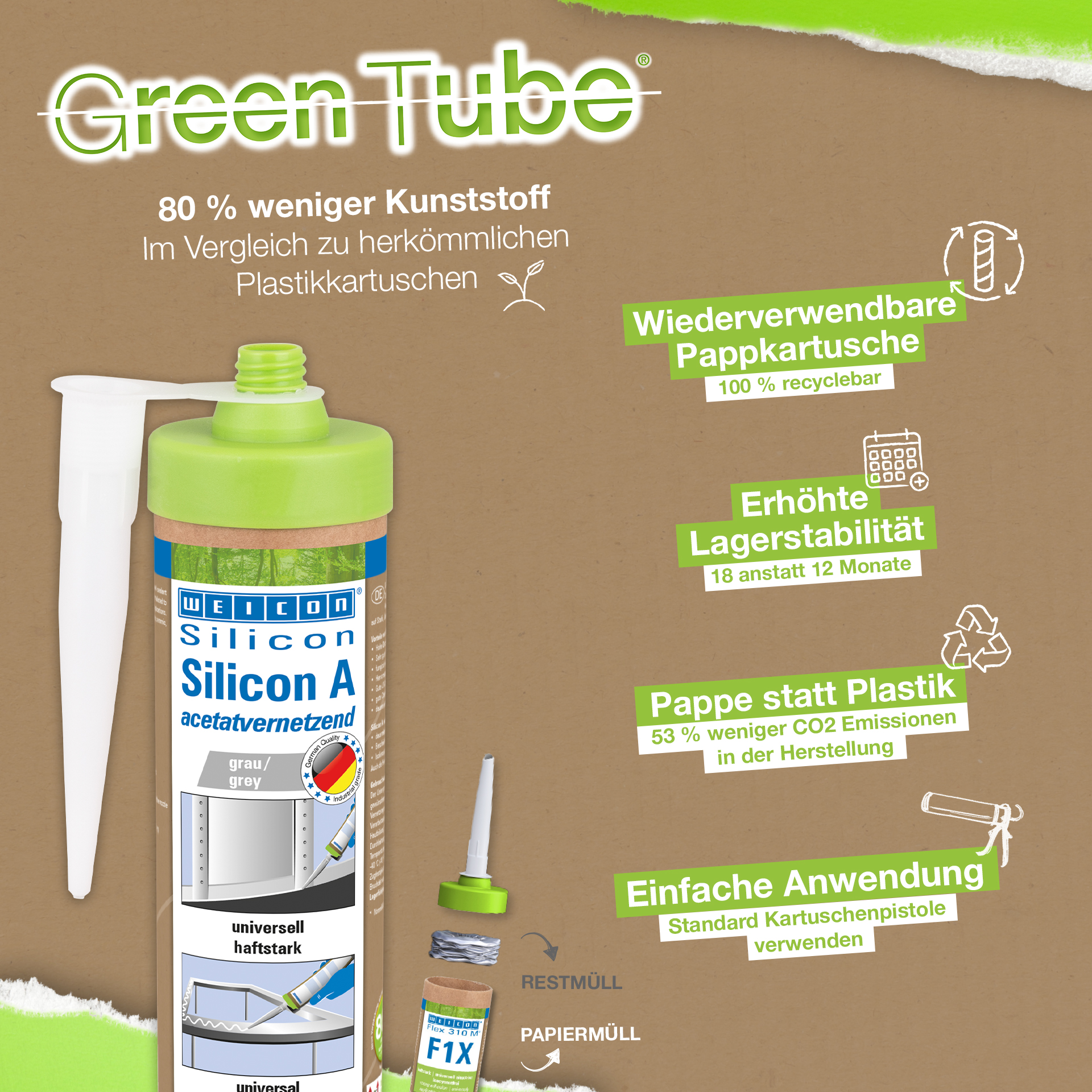Adezivul si etansantul WEICON Silicon A nu contine solventi, are o structura reticulara de tip acetat, este puternic, permanent elastic, rezistent la imbatranire si agenti chimici, rezistent la temperaturi de pana la +180 °C (+356 °F), este extrem de elastic (alungirea la rupere >700%) si este de uz universal. Silicon A adera foarte bine la otel, aluminiu, sticla, ceramica si multe alte materiale WEICON Silicon A poate fi utilizat la constructia de masini si ansambluri, la sistemele de ventilatie si aer conditionat, in industria energetica si electrica, la constructia de standuri expozitionale si de prezentare in magazine si in multe alte aplicatii industriale.