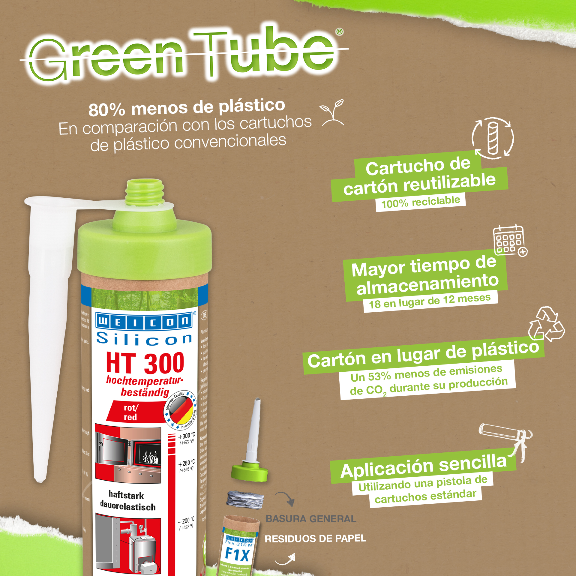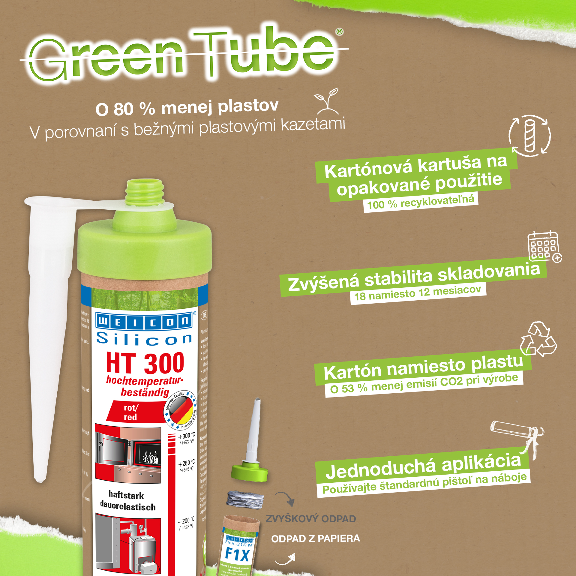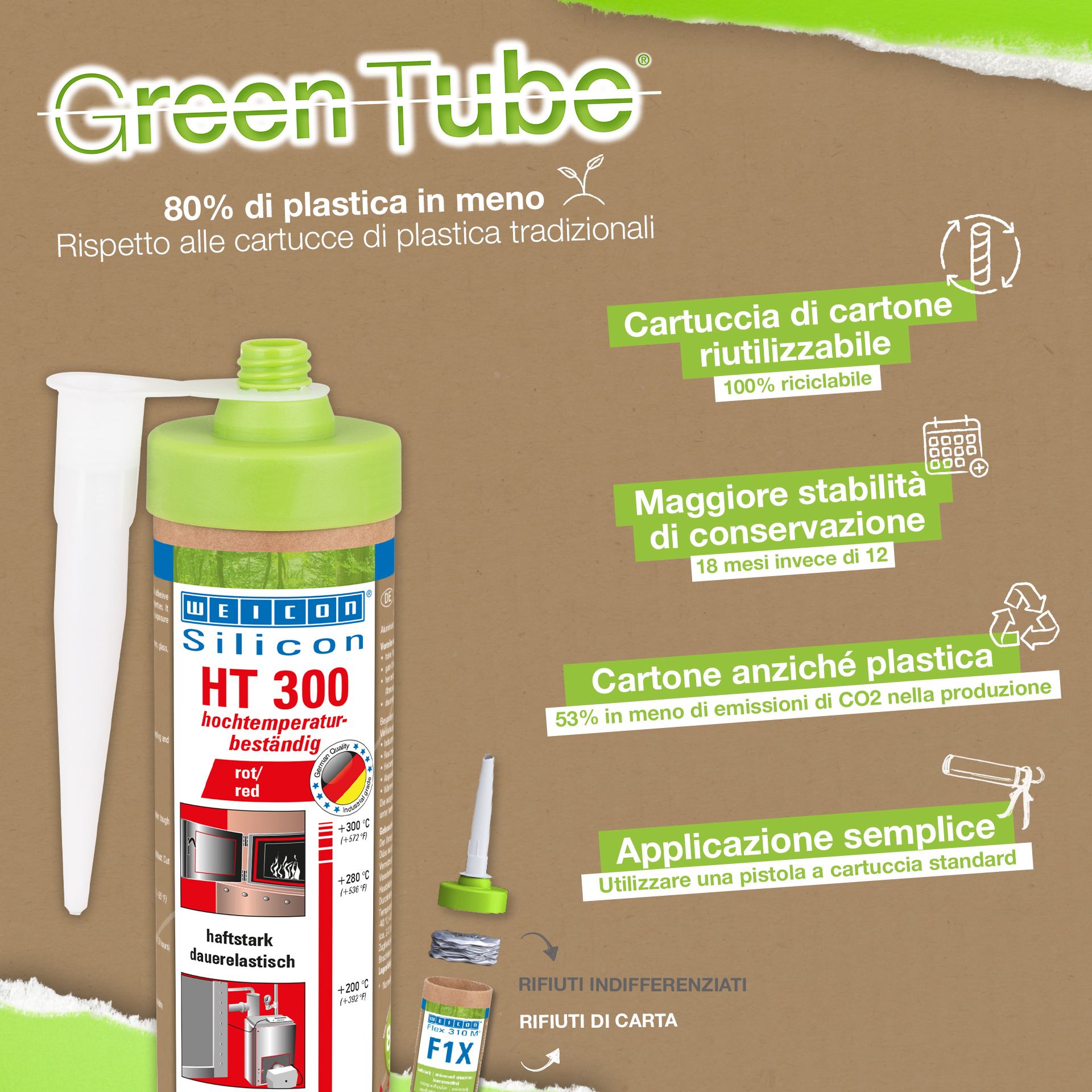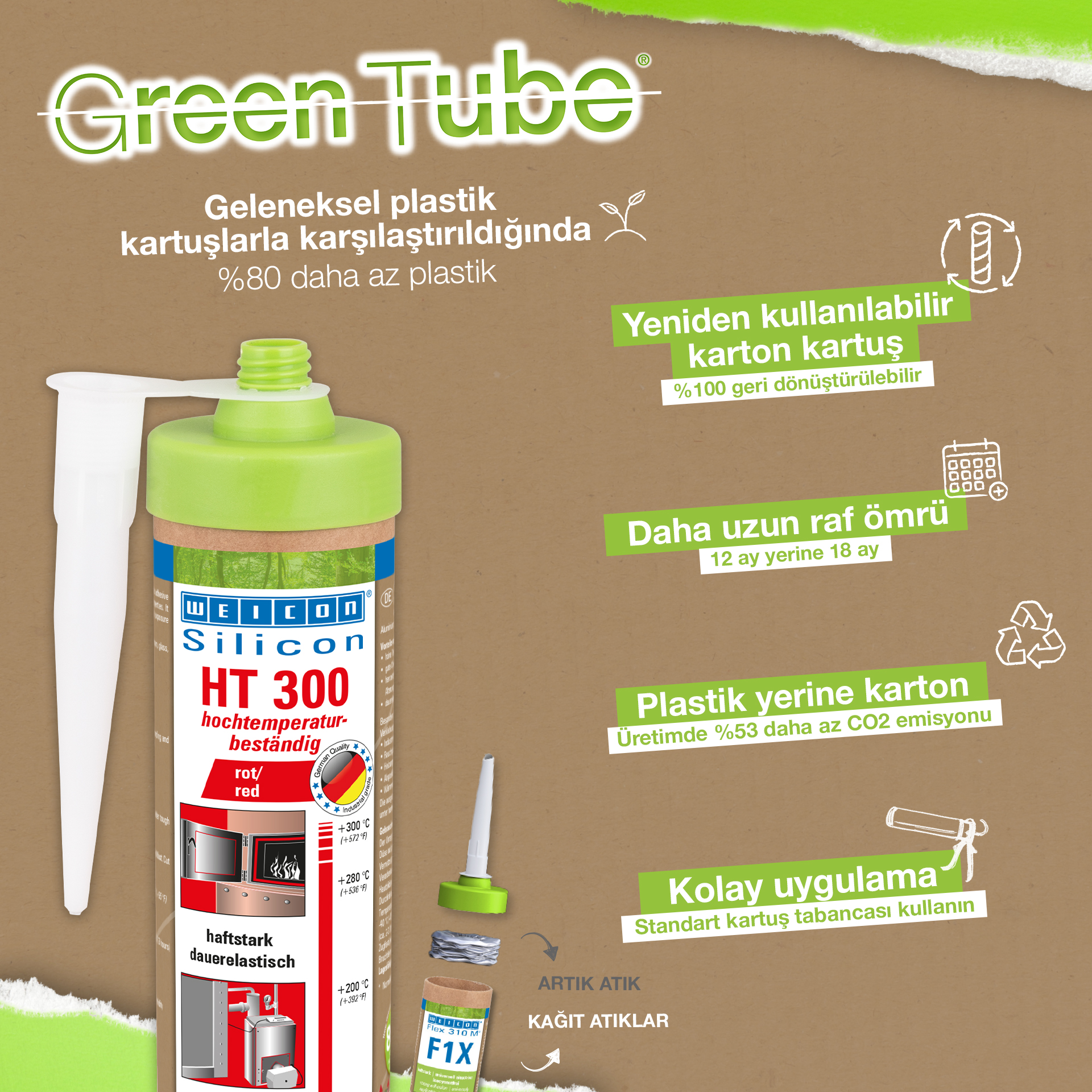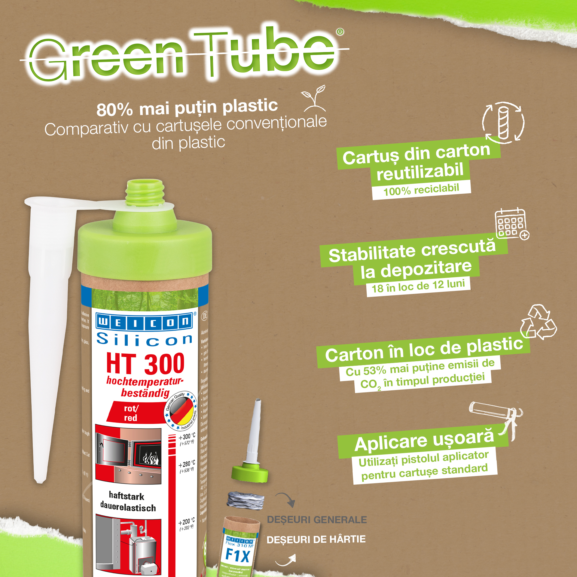 Adezivul si etansantul WEICON HT 300 este rosu, rezista la temperaturi inalte (+300 °C), nu contine solventi, este puternic si are o structura reticulara de tip acetat. Rezista la intemperii, fenomene de imbatranire si agenti chimici si este extrem de elastic (alungirea la rupere de aprox. 300%) HT 300 se preteaza in mod special la realizarea unor lipiri expuse la caldura, avand o capacitate foarte buna de etansare si aderenta la otel, aluminiu, sticla, ceramica si multe alte materiale. HT 300 poate fi utilizat la furnale industriale, sisteme de gaze de ardere, instalatii de incalzire, sisteme de exhaustare a gazelor, instalatii de incalzire si multe altele.