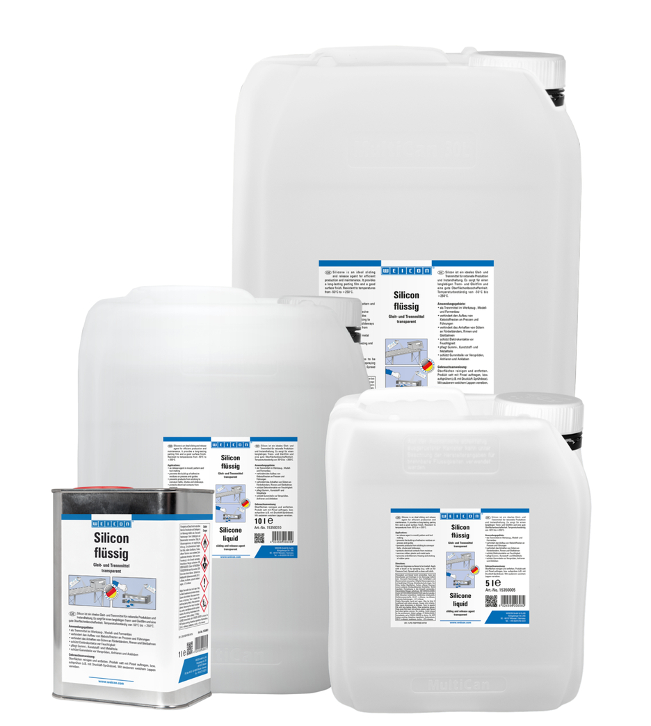 Lichidul tehnic silicon este produsul ideal pentru ungere si separare in cadrul aplicatiilor de productie si intretinere. Serveste de asemenea ca si solutie de protectie si ingrijire a suprafetelor din plastic, cauciuc precum si metal si rezista la temperaturi de pana la +250°C. WEICON Silicon poate fi utilizat in multe aplicatii industriale. Lichidul tehnic silicon previne acumularea de reziduuri de adezivi pe prese si ghidaje, previne lipirea produselor de benzile conveioarelor, canale si jgheaburi, protejeaza contactele electrice de umiditate, este util in ingrijirea cauciucului, plasticului şi a parţilor metalice, protejeaza componentele din cauciuc de friabilitate, ingheţ şi aderenta, permite funcţionarea optima a trapelor, şinelor, scaunelor şi rolele centurilor de siguranţa.