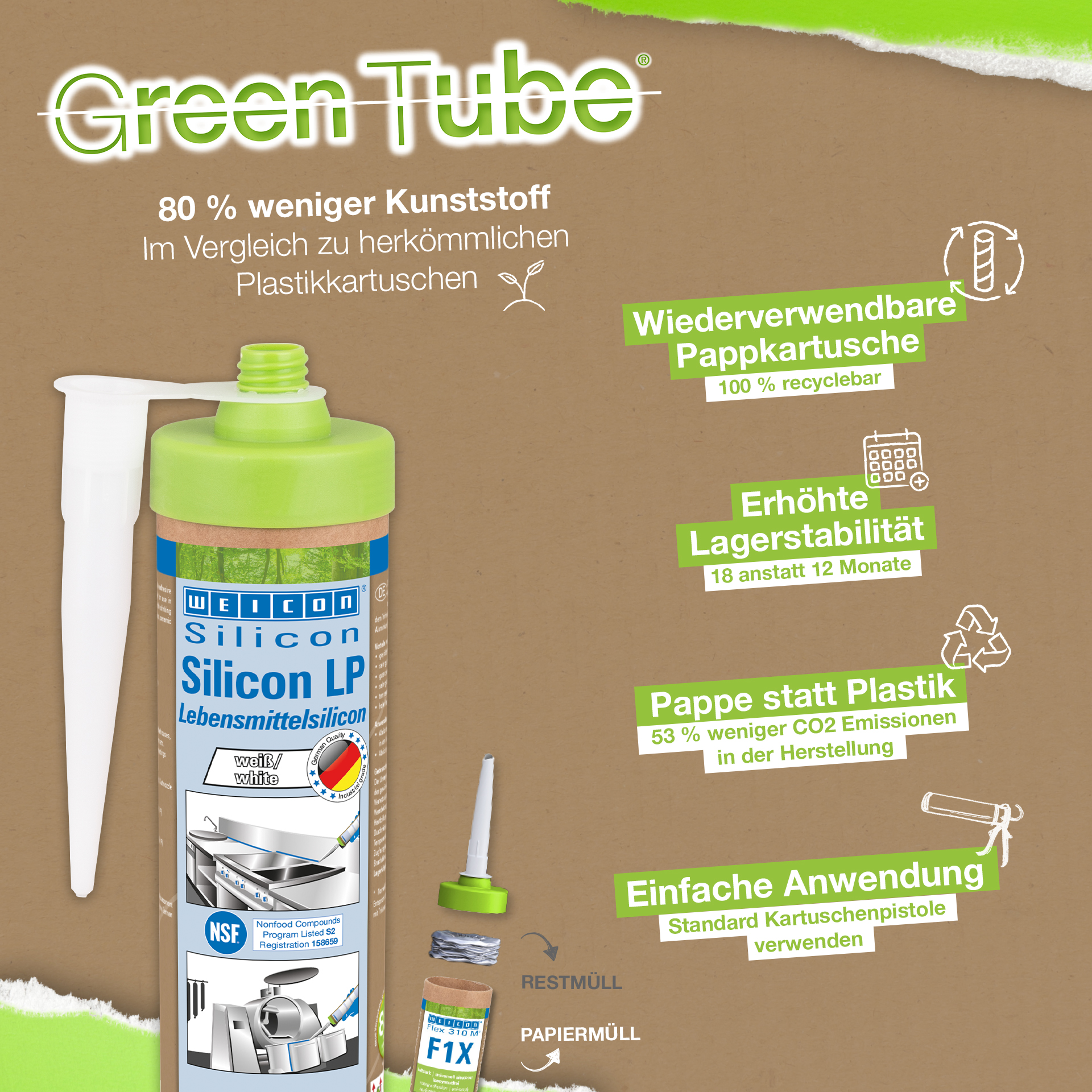 Siliconul WEICON LP este un adeziv și etanșant permanent elastic cu întărire de tip acetat. Este rezistent la agenți chimici, îmbătrânire, intemperii și la radiații UV, cu o rezistență la temperaturi de până la +180 °C. Aderă bine la oțel, aluminiu, sticlă, plastic și multe alte materiale. Silicon LP a fost dezvoltat special pentru utilizare în domenii sensibile. Poate fi utilizat ca și etanșant în domeniul alimentar și al apei potabile, putând fi utilizat de exemplu în unități de procesare a laptelui sau a cărnii, în producția de alimente și băuturi sau în cantine. Testat de Institutul pentru Igienă din Regiunea Ruhr ("Hygiene-Institut des Ruhrgebiets") în conformitate cu Ghidul pentru Evaluarea igienică a lubrifianților în contact cu apa potabilă (Reglementările KTW) al Agenției Federale de Mediu din Germania.