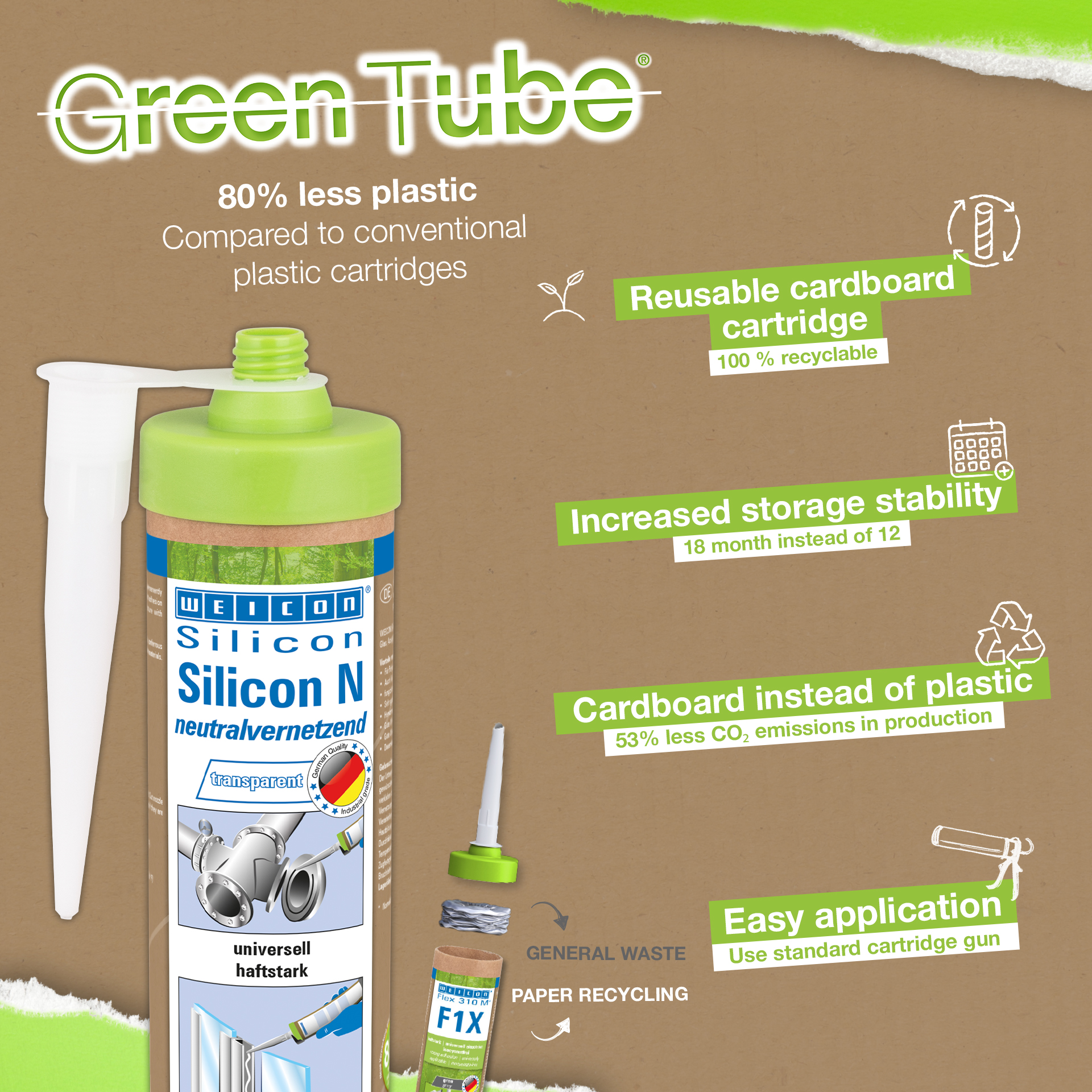 Adezivul si etansantul WEICON Silicon N nu contine solventi, este neutru la intarire, puternic, permanent elastic, rezistent la intemperii, la fenomene de imbatranire si agenti chimici, precum si la temperaturi de pana la +180 °C, este extrem de elastic, (alungirea la rupere de aprox. 550%) si de uz universal. Silicon N adera foarte bine la toate metalele, sticla, ceramica si la multe alte materiale. WEICON Silicon N poate fi utilizat in industria maselor plastice, in industria electrica, energetica, la corpurile iluminat, la standuri de expozitie si de vanzare si in multe alte aplicatii industriale.