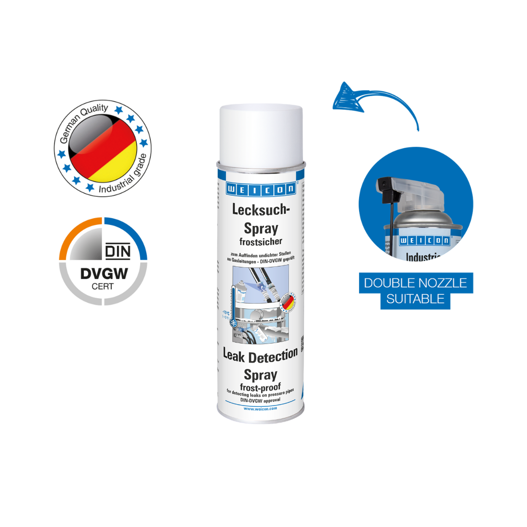 Metoda sigura, usoara si rapida ce permite detectarea scurgerilor sau porozitatilor la nivelul conductelor de gaze. Spray-ul de dectare gaz rezistent la inghet nu formeaza compuşi daunatori cu urmatoarele gaze: dioxid de carbon (CO2), propan, butan, acetilena, gaze naturale, nitrogen, monoxid de azot (N2O) şi CFC si nu este inflamabil. Spray-ul de detectare gaz rezistent la inghet poate fi utilizat peste tot unde se lucreaza cu aer comprimat sau alte tipuri de substante gazoase, de exemplu la tevi, furtunuri, armaturi, conexiuni insurubate, robinete si adaptori.