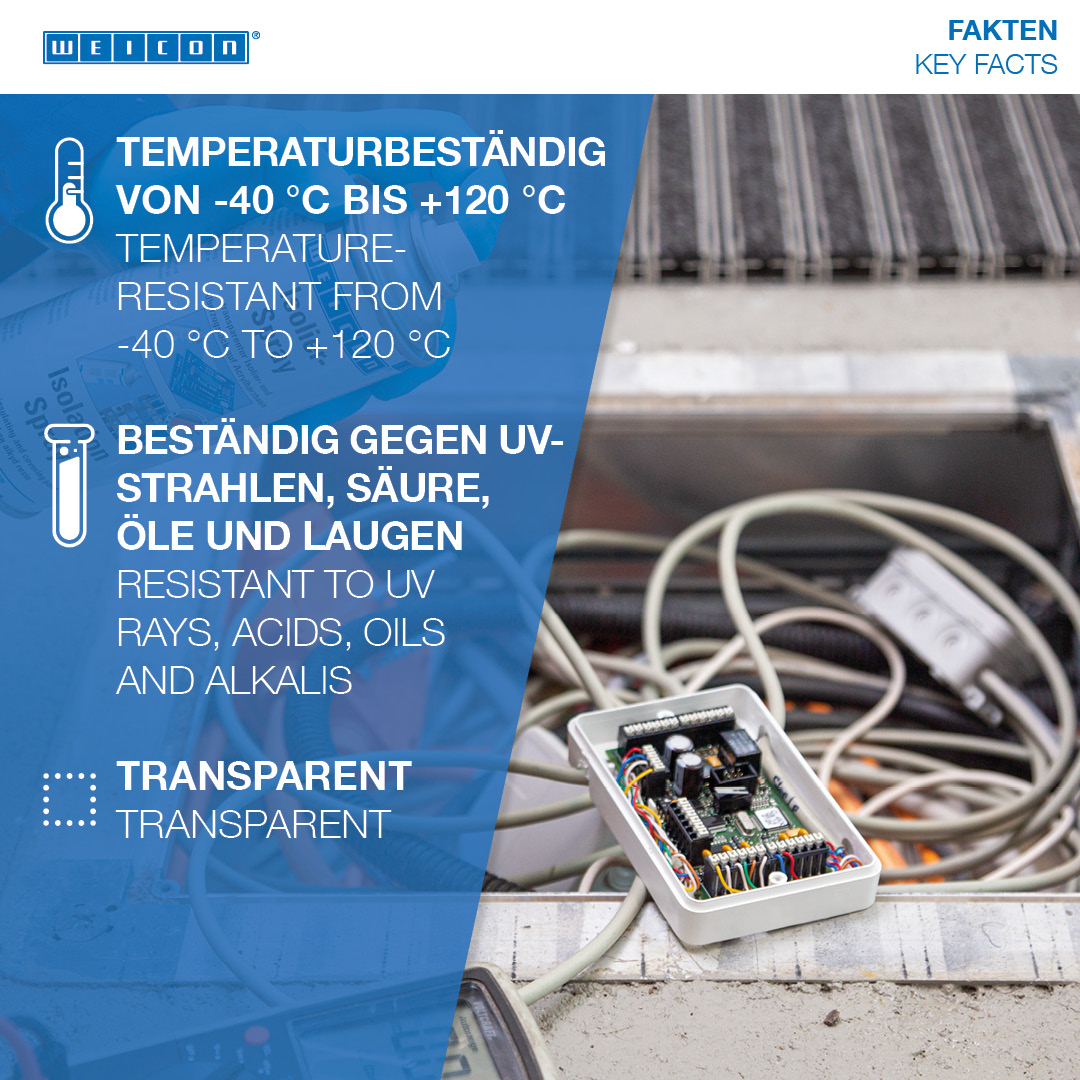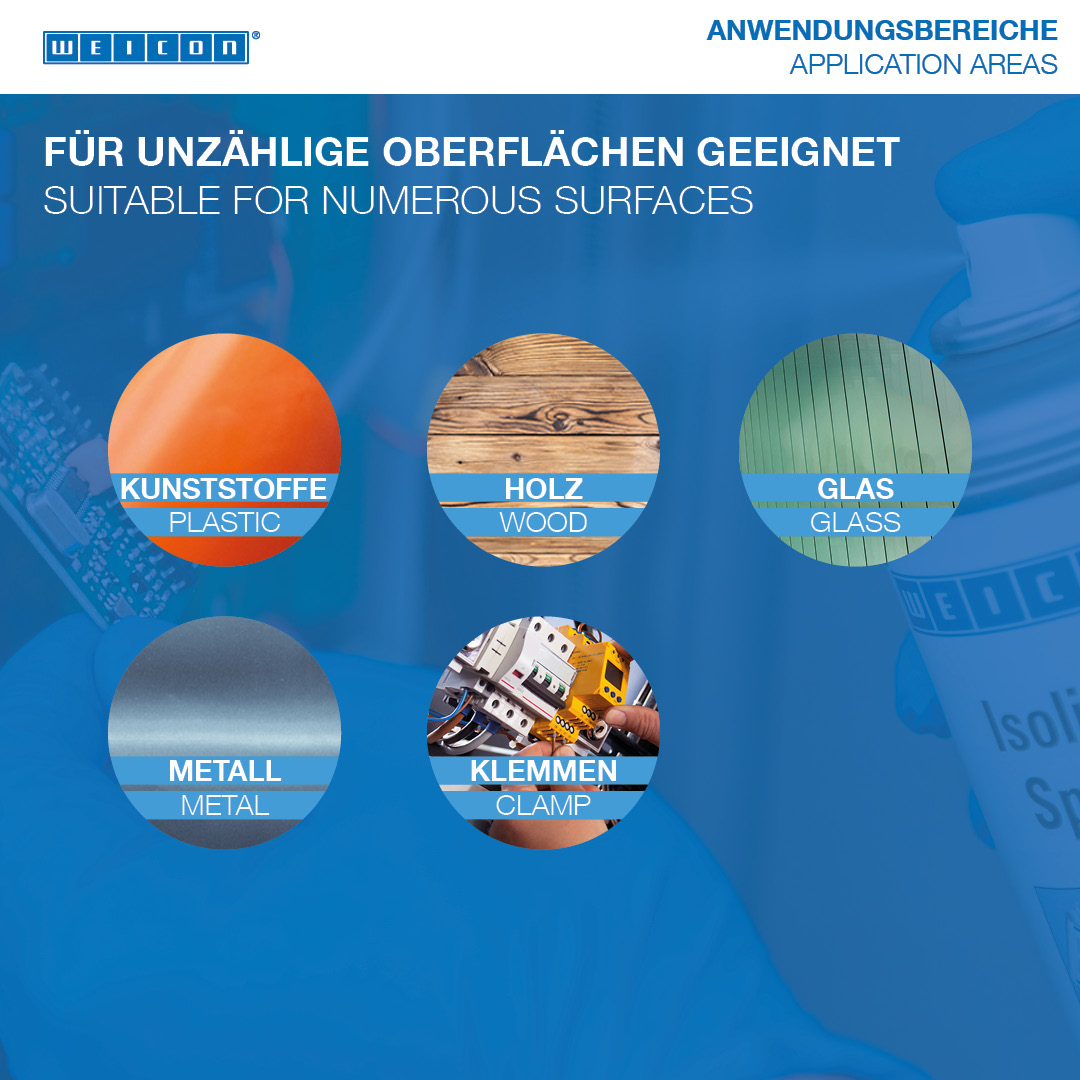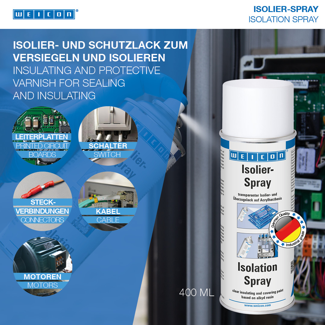 WEICON Spray Izolator este o un produs izolator transparent si vopsea de acoperire pe baza de rasini alchidice. Se intareste formand un film flexibil si rezistent cu aderenta excelenta la majoritatea suprafetelor obisnuite cum ar fi metalul, sticla, plasticul, lemnul, etc. Spray-ul izolator este rezistent la raze UV, acizi si baze, uleiuri, fiind in acelasi timp rezistent la umezeala si impermeabil si avand o inalta rezistenta dielectrica. Spray-ul serveste ca si acoperire de protectie pentru conexiuni electrice, intrerupatoare, panouri de comanda, componente electrice si bobine precum si ca izolator universal in ingineria electrica sau pentru repararea izolatiilor de la nivelul motoarelor electrice, etc.