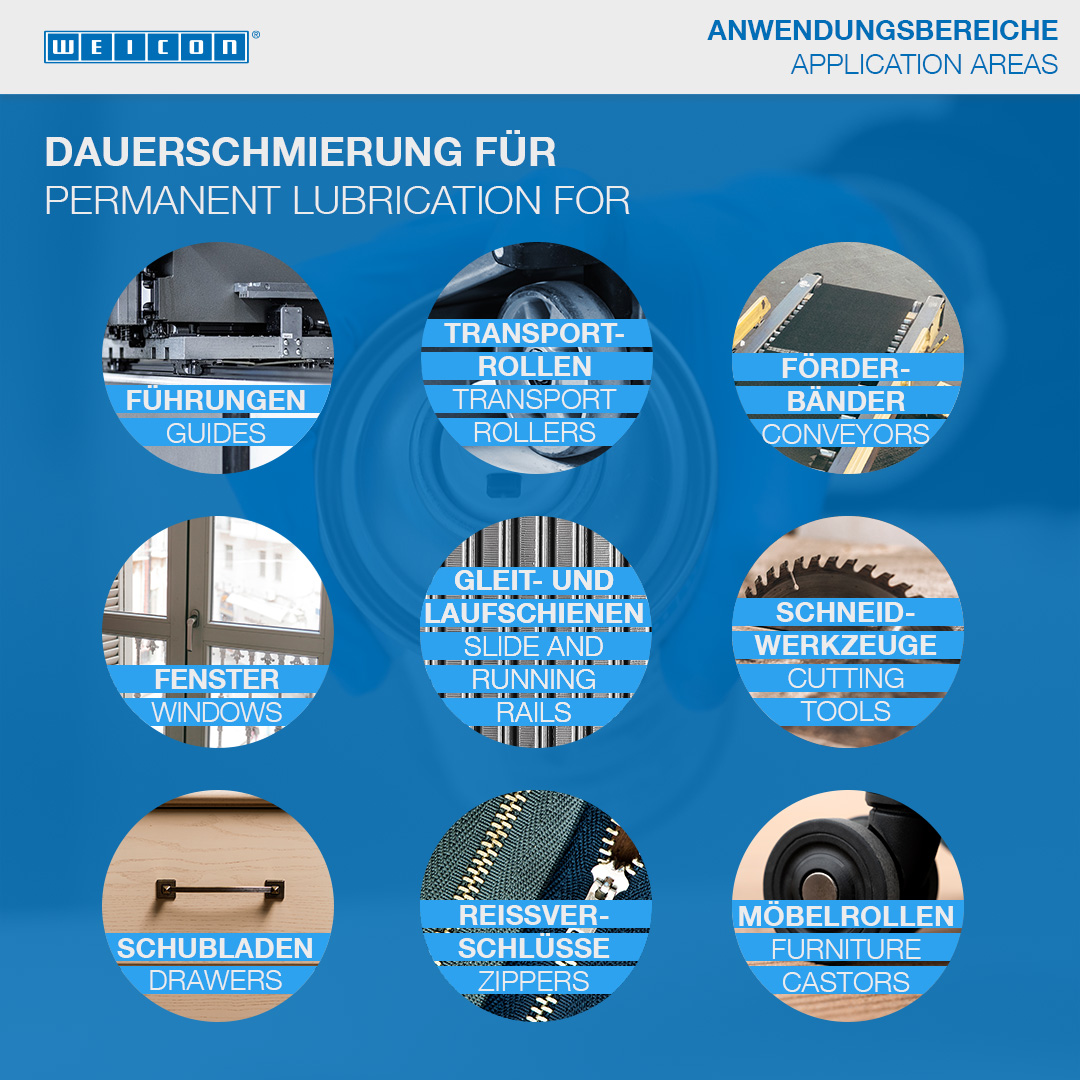 WEICON PTFE-Spray este un lubrifiant uscat, fara vaselina, pe baza de PTFE, cu proprietati excelente de alunecare. Spray-ul WEICON PTFE adera la metal, plastic si suprafete din lemn. Continutul inalt de PTFE reduce considerabil coeficientul de frictiune. Filmul de lubrifiant respinge umezeala si apa si este rezistent la uleiuri, grasimi si multi agenti chimici. Spray-ul PTFE poate fi utilizat pe canale de turnare si ghidaje, curele de conveioare, role transportoare, linii de alunecare, ferestre, scule taietoare si masini de ambalare. De asemenea poate fi utilizat ca si lubrifiant permanent pentru arbori la rulmentii din plastic, ca si acoperire hidrofuga la etansarile din carton sau pluta sau la sigiliile ambalajelor, ca si inlocuitor pentru agentii de separare cu continut de silicon si in orice situatie in care nu se doreste sau nu se permite lubrifierea cu uleiuri sau vaseline. Produsul poate fi utilizat in multe aplicatii industriale.