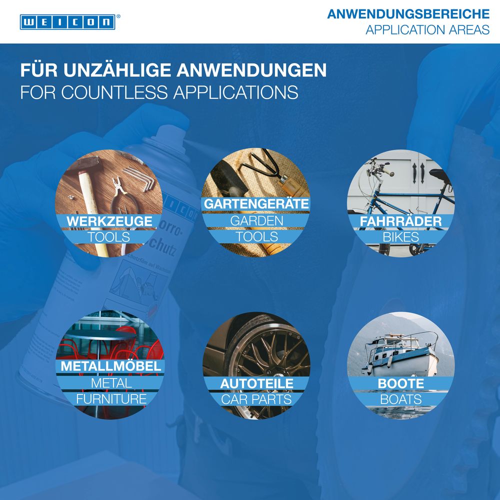 Spray-ul de protecție anticorozivă WEICON creează un film protector aprobat de organismul de certificare german TÜV. Conferă o protecție de durată a sculelor și pieselor de precizie acoperindu-le cu un strat ceros uscat. WEICON Protecție anticorozivă poate fi utilizat ca și protecție sigură a pieselor metalice netratate și nevopsite, pentru depozitarea pieselor de lucru la interior, pentru protejarea acestora în timpul transportului maritim, precum și pentru conservarea sculelor și pieselor de precizie. Stratul protector poate fi îndepărtat cu ușurință (ex. cu WEICON Degresant S).