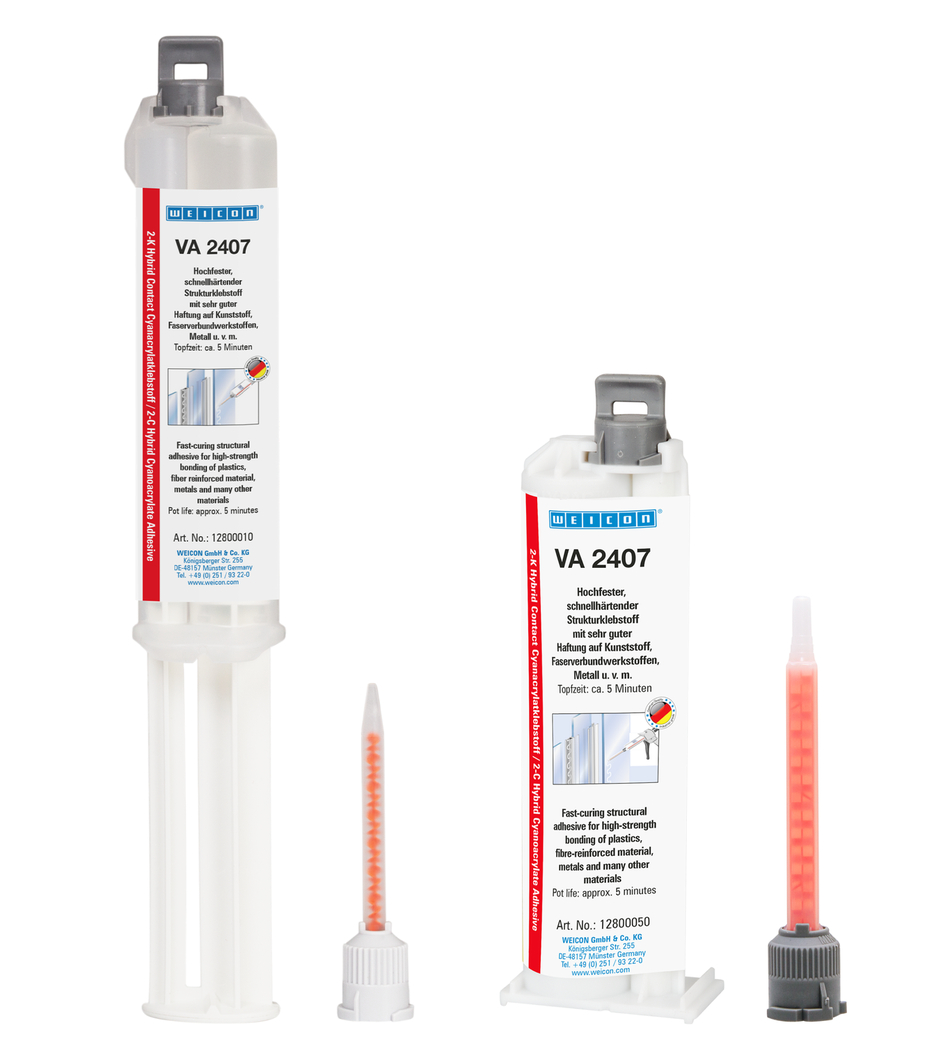 VA 2407 este un adeziv cianoacrilat bicomponent incolor, transparent după întărire pentru lipirea unei mari varietăți de materiale între ele și unele cu altele. Aderă foarte bine la multe materiale plastice (de exemplu, policarbonat), oțel, oțel inoxidabil, aluminiu, ceramică, sticlă și cauciuc. Adezivul nou dezvoltat combină avantajele adezivilor instant cu fiabilitatea procesului adezivilor bicomponenți. Adezivul structural de înaltă rezistență și întărire rapidă poate fi șlefuit și vopsit după aproximativ 25 de minute. Este rezistent la intemperii, la multe substanțe chimice agresive, la solicitări de impact și la vibrații. Este rezistent la temperaturi cuprinse între -20 °C și +120 °C (-40 și +248 °F). În funcție de geometria lipirii, cu VA 2407 se pot acoperi spații de până la 5 mm. Datorită întăririi sale rapide și rezistenței la impact, este deosebit de potrivit pentru lipirea, de exemplu, a plasticului și a cauciucului. De asemenea, poate fi utilizat pentru lipirea de tip structural, în cazul în care o îmbinare adezivă colorată ar afecta aspectul general al componentei. VA 2407 lipește între ele materiale plastice transparente, cum ar fi plexiglasul și alte materiale, într-un mod curat și atractiv din punct de vedere vizual. Adezivul este potrivit pentru o mare varietate de aplicații în tehnologia plasticului, construcții mecanice, construcții de machete și matrițe, construcții metalice, construcții de nave și ambarcațiuni, construcții de caroserii și vehicule, construcții de târguri și expoziții și multe alte domenii industriale.