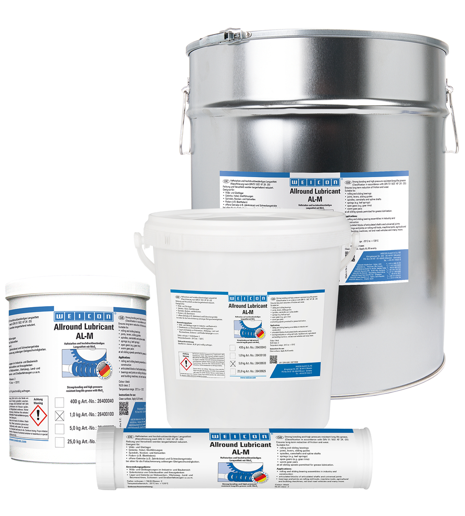 Vaselina WEICON AL-M reduce fricțiunea și uzura pe termen lung și este potrivită pentru lubrifierea rulmenților și lagărelor de alunecare, articulațiilor, pârghiilor, ghidajelor de glisare, a arborilor canelați și a arborilor cu camă, a arcurilor, angrenajelor deschise, angrenajelor melcate la toate vitezele permisibile pentru lubrifierea cu vaselină.