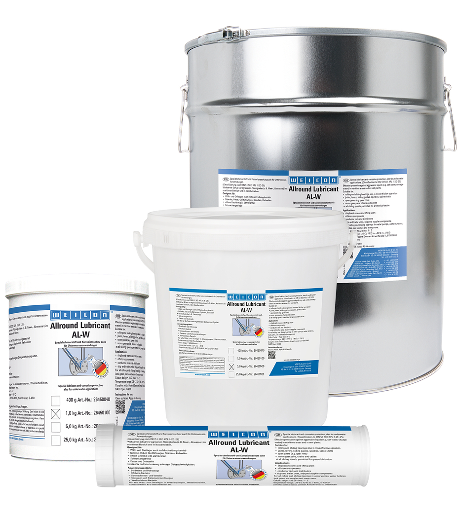 WEICON AL-W oferă o protecție eficientă împotriva lichidelor agresive precum apa de mare sau apa menajeră, atât în sectorul maritim cât și în cel al uzinelor de apă. WEICON AL-W se recomandă pentru lubrifierea rulmenților cu role și lagărelor de alunecare chiar și în condiții de funcționare cu fricțiune mixtă, lubrifierea lagărelor basculante, a pârghiilor, a mecanismelor de glisare, a axelor, a arborilor canelați, a angrenajelor deschise sau melcate, a lanțurilor și șufelor, la toate vitezele permise pentru lubrifierea cu vaselină.