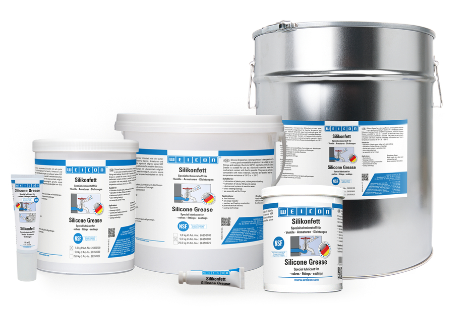 Vaselina siliconică WEICON este foarte aderentă, transparentă și înalt compatibilă cu materialele plastice. Datorită certificării sale NSF H1, este recomandată ca lubrifiant pentru supape, fitinguri și garnituri în domenii sensibile. Respectă cerințele Ghidului pentru evaluarea igienică a materialelor organice în contact cu Apa potabilă (Reglenentările KTW) emise de Agenția Federală de Mediu. Poate fi utilizată în industria alimentară și a băuturilor, în industria sanitară și a elementelor de încălzire, în industria farmaceutică precum și în tehnologia de etanșare. Vaselina siliconică WEICON este testată de pentru siguranță conform BAM -a se vedea instrucțiunile Q34-1 "Lista materialelor non-metalice pentru utilizare în instalații de oxigen (informarea DGUV 213-075) a BG RCI. Vaselina este în mod special pietenoasă cu materialele, cu miros și gust neutru și are o rezistență la temperatură cuprinsă între -50C și + 200C. Vaselina siliconică WEICON este potrivită pentru lubrifierea materialelor plastice, a cauciucului și a garniturilor, a valvelor, armăturilor și etanșărilor, a echipamentelor de mașini, a rulmenților cu viteză de rotație scăzută și ca și ajutor de montaj pentru O-ring-uri.