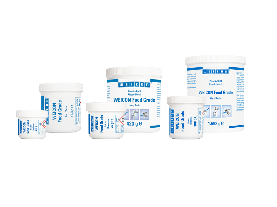 WEICON Food Grade este un sistem de acoperiri de suprafață aprobat de Insistatul de Igiena din Regiunea Ruhr pentru contactul cu substanțe apoase și grase până la 70 °C. Este utilizat atât pentru acoperirea suprafețelor precum și ca și adeziv. Aceste rășini epoxidice bicomponente sunt turnabile și conțin un procentaj înalt de fileri minerali. Acoperirea este ușor de aplicat și aderă la o mare varietate de suprafețe chiar și sub stres mecanic. Food Grade prezintă o rezistență chimică foarte bună și este potrivit pentru acoperirea celor mai diverse piese de la pompe, la sisteme transportoare, șuruburi de ridicare, buncăre, rezervoare și conducte. Grație certificării pentru industria alimentară, acoperirea este potrivită în aplicații din sectorul apei potabile, din industria băuturilor, industria farmaceutică, industria chimică, bucătării comerciale, brutării sau în producția de alimente. WEICON Food Grade poate fi utilizat singur sau în combinație cu alte tipuri de Metale Plastice pentru obținerea unor sisteme de acoperire de suprafață complexe