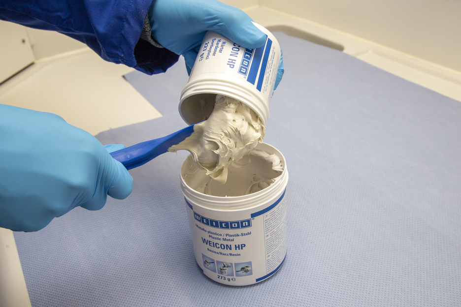 WEICON HP este o rășină epoxidică bicomponentă cu aderență deosebit de înaltă, rezistență la impact extrem de mare precum și o înaltă elasticitate reziduală și i rezistență la abraziune. Datorită întinderii sale ridicate la rupere și a texturii de tip pastă, WEICON HP poate fi utilizat pentru reparații, ca protecție împotriva abraziunii, precum și pentru căptușirea echipamentelor puternic solicitate. De asemenea, adezivul prezintă o aderență excelentă pe suprafețe umede și ude și în aplicații subacvatice.